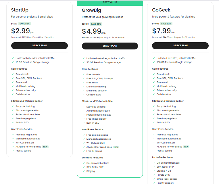 Prices may vary depending on the country, currency, and active promotions. Check the official SiteGround website to see the most up-to-date pricing.